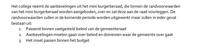 Op dit moment berekende CE-Delft dat het huidige beleid kan uitkomen tussen de 7 en 54%. Deze onzekerheidsmarge is te groot voor dit groene college. Het mini-burgerberaad moet voor de verkiezingen in 2022 met adviezen komen zodat deze betrokken kunnen worden bij de campagnes. Er zijn wel restricties. Zo mag het vastgestelde beleid niet ter discussie worden gesteld, terwijl dat beleid wellicht de reden is dat burgers de gemeente te hulp moeten schieten.